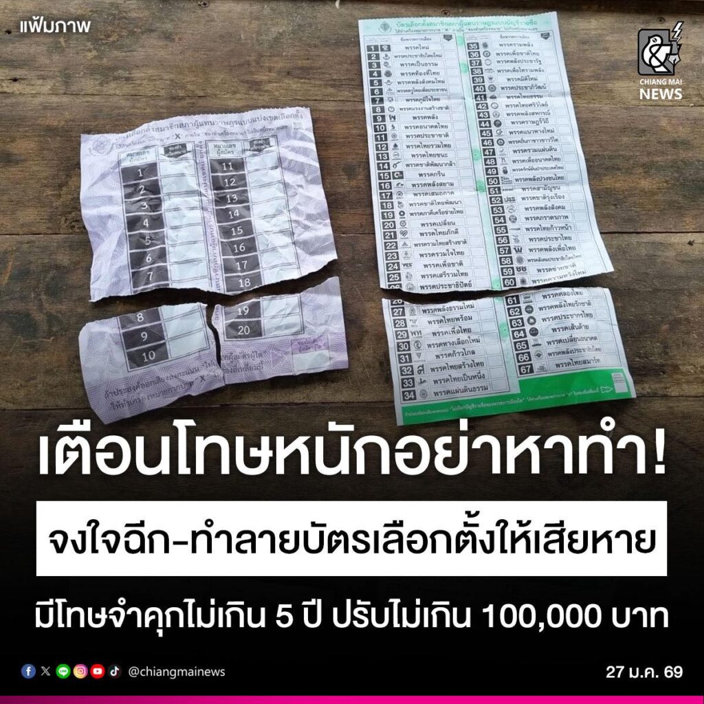 投票用紙を破ったり損傷させたりする行為は懲役5年以下罰金10万バーツ以下の重罪になります。