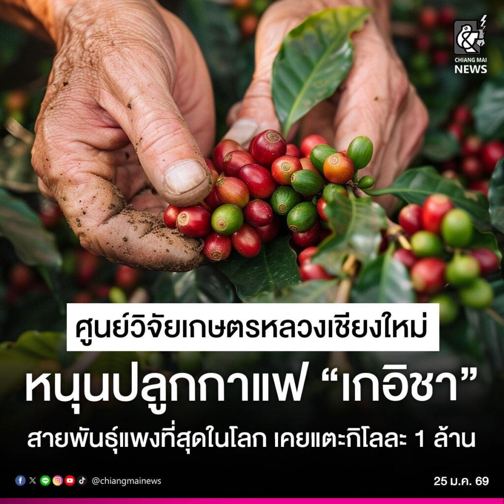 チェンマイ王室農業研究センター(クンワーン)が世界的に有名な「ゲイシャコーヒー」の品種拡大に成功しました。このコーヒーは、かつて1Kgあたり100万バーツという最高値を記録したことがあります。農業技術局は品種を増やして苗を配布し、近く栽培を促すことを目標としています。