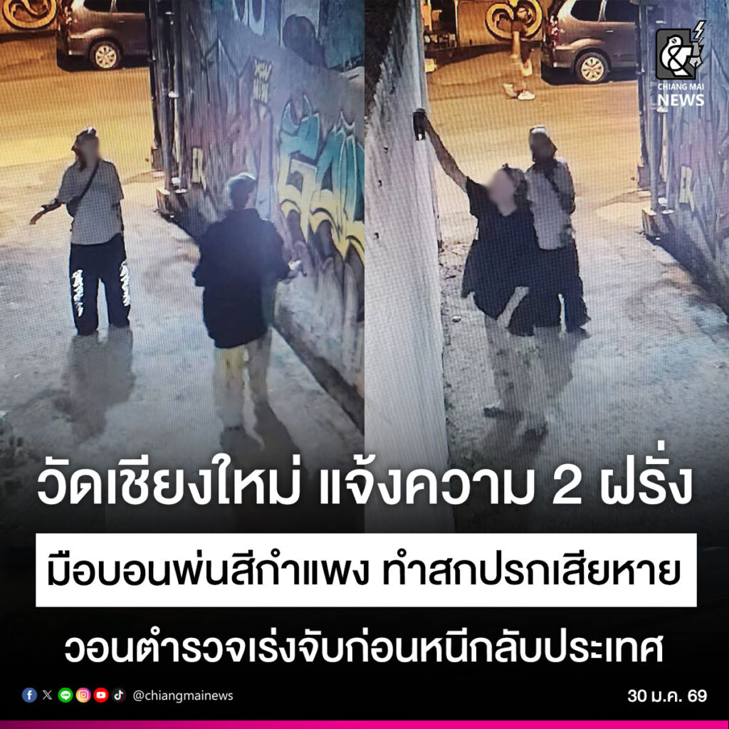 チェンマイ市のドークウアン寺の僧侶が外人の女性と男性2人による落書き被害を警察に届け出ました。この2人はスプレーでお寺の壁に汚し損傷させたもので、僧侶は警察に早急な追跡と法的処罰を求めています。