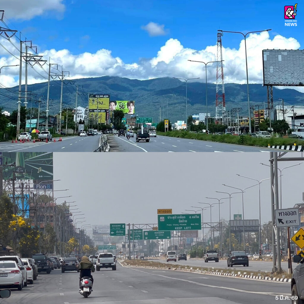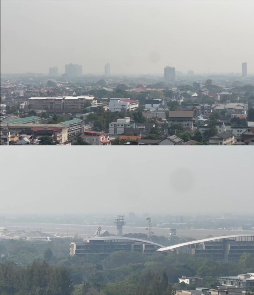 はっきりと分かるほど、煙霧による大気汚染が危機的に深刻化、PM2.5の値が何倍にも跳ね上がっています。澄み切った青空だったチェンマイが今や濁った空に覆われ、ドイステープの姿も煙霧でかき消されてしまいました。視界は悪化し、高い場所から見下ろすチェンマイ市街は一面霞んでいます。